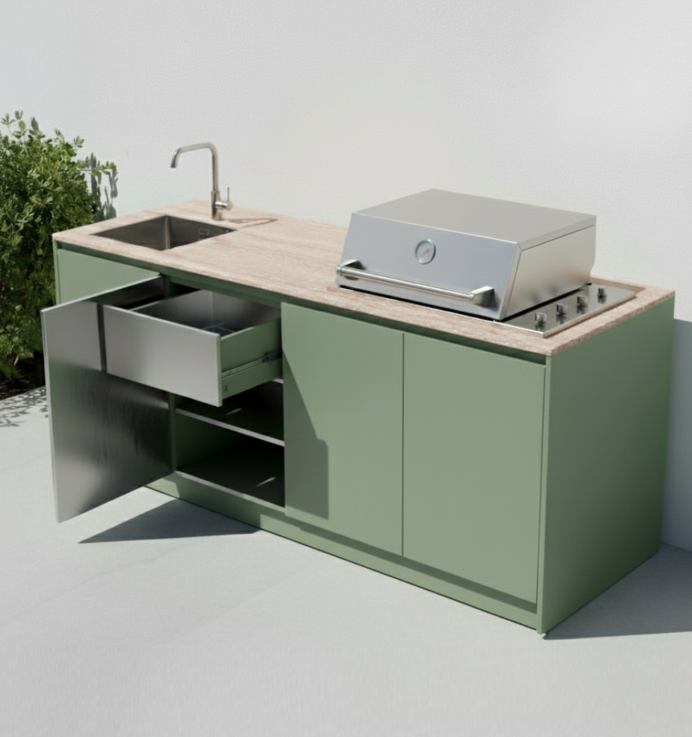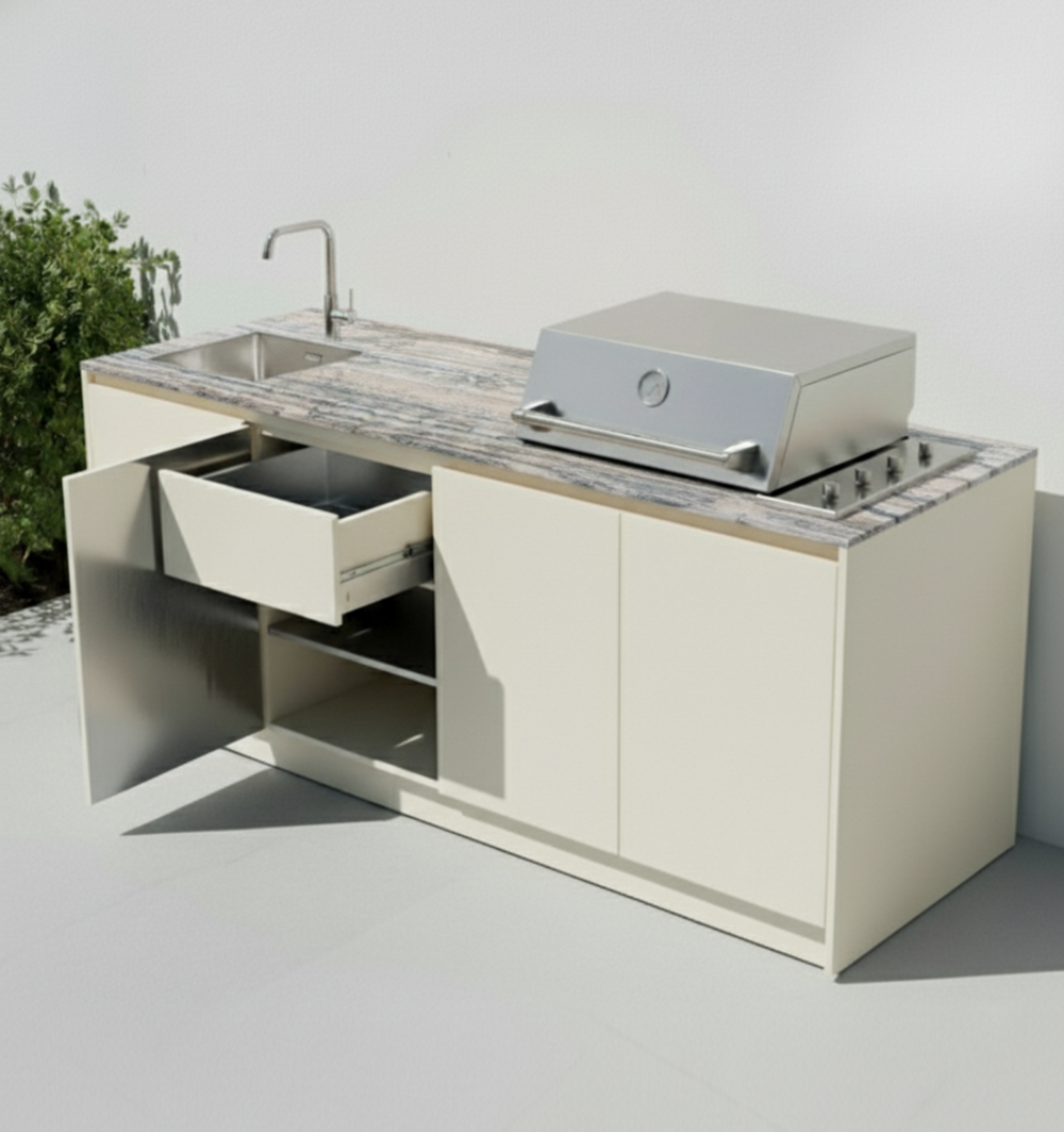 Bloqo outdoor kitchens stand out through their construction, crafted from precision-engineered 18mm 304 stainless steel panels for exceptional durability. This advanced design ensures full fire resistance while maintaining uncompromising aesthetics.