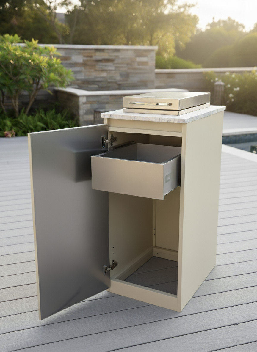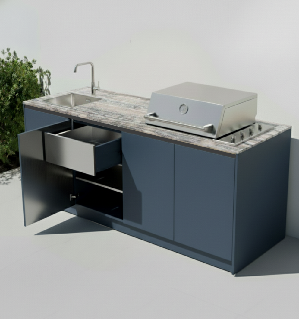 Every Bloqo outdoor kitchen is a statement of craftsmanship — combining refined finishes and ergonomic comfort. Advanced Blum technology ensures effortless motion, while three concealed drawers keep everything beautifully organized.