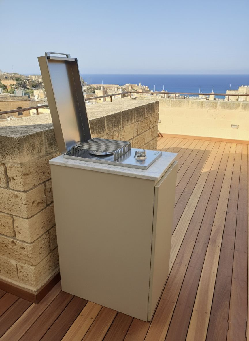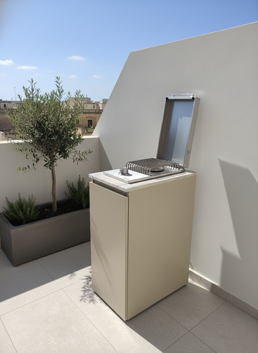 Compact, clever, and chic – this gas-cover hides your utilities in style while giving you a built-in burner, soft-close drawer, and mini countertop. Ideal for mini terraces, it lets you cook outdoors and leave your indoor kitchen free of odours.